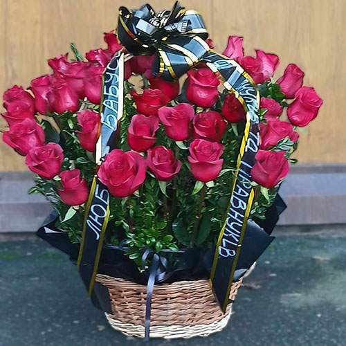 Коли слів недостатньо, нехай цей красномовний траурний букет із 36 червоних троянд у класичному плетеному кошику скаже за вас про головне. Глибокий червоний колір є потужним символом кохання, поваги та спогадів, що робить його чудовою даниною пам’яті коханій людині. Вишукане оформлення обов’язково принесе розраду та підтримає тих, хто у жалобі.