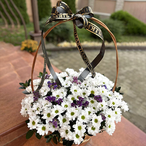Трепетная и нежная композиция – ритуальная корзина – воплощает в себе светлый образ ушедших дней. Белоснежные ромашковые хризантемы, украшенные деликатным фиолетовым акцентом, создают атмосферу тёплых и эмоциональных воспоминаний. Этот символический букет призван увековечить ценность и красоту моментов, оставленных в сердцах